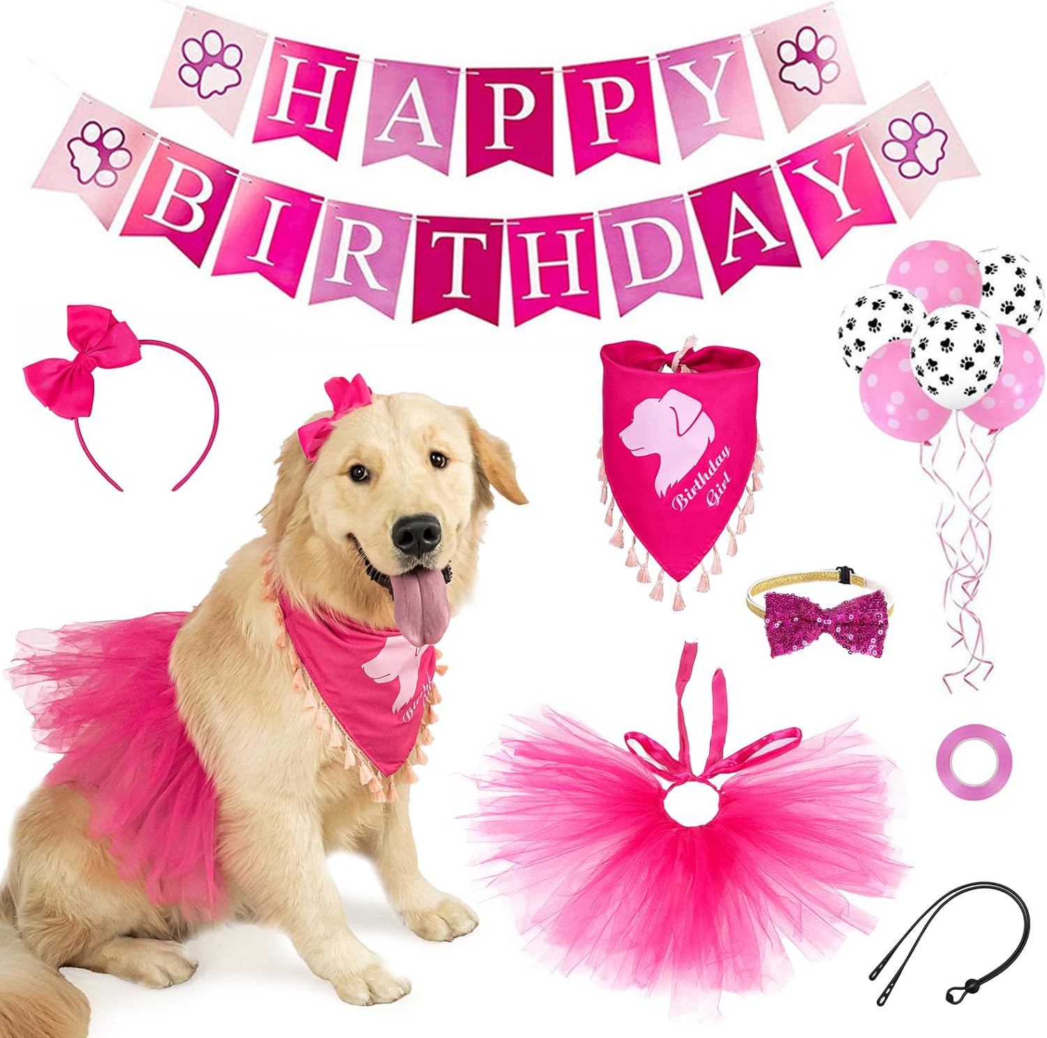 Canino Cumpleaños Get Together Proporciona Set:Canino regalo de cumpleaños va bien con contiene 1 x rosa Tassel canino bandana 1x canino Hairband, 1xNegro cuerda abrochada ,Joyful Birthday Papel Colgante Decoración, 1 x Pink Tutu Falda, 1 x pajarita canina. Decoraciones de cumpleaños están llenos, puede disfraz de su canino en esencialmente el más encantador.